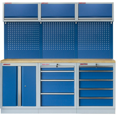Dílenský nábytek PROFI BLUE s dřevěnou deskou zaujme moderním a profesionálním vzhledem. Kombinace modré RAL 5023 a šedé RAL 7035 barvy se bude vyjímat v každé garáži i dílně. Sestava nábytku v sobě skrývá dostatečné množství úložného prostoru pro vaše nářadí, autotechniku i dílenské vybavení. V kombinaci s bytelnou pracovní deskou získáte multifunkční stěnu, se kterou vám půjde práce od ruky ve všech směrech. Jednotlivé komponenty jsou plně konfigurovatelné, sestavu je možné dle vašich potřeb rozšířit o další skříně, regály i ponk.Sestava nábytku MTGS1300BC