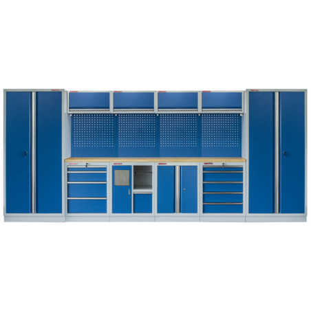 Dílenský nábytek PROFI BLUE s dřevěnou deskou zaujme moderním a profesionálním vzhledem. Kombinace modré RAL 5023 a šedé RAL 7035 barvy se bude vyjímat v každé garáži i dílně. Sestava nábytku v sobě skrývá dostatečné množství úložného prostoru pro vaše nářadí, autotechniku i dílenské vybavení. V kombinaci s bytelnou pracovní deskou získáte multifunkční stěnu, se kterou vám půjde práce od ruky ve všech směrech. Jednotlivé komponenty jsou plně konfigurovatelné, sestavu je možné dle vašich potřeb rozšířit o další skříně, regály i ponk.Sestava nábytku MTGS1301AE